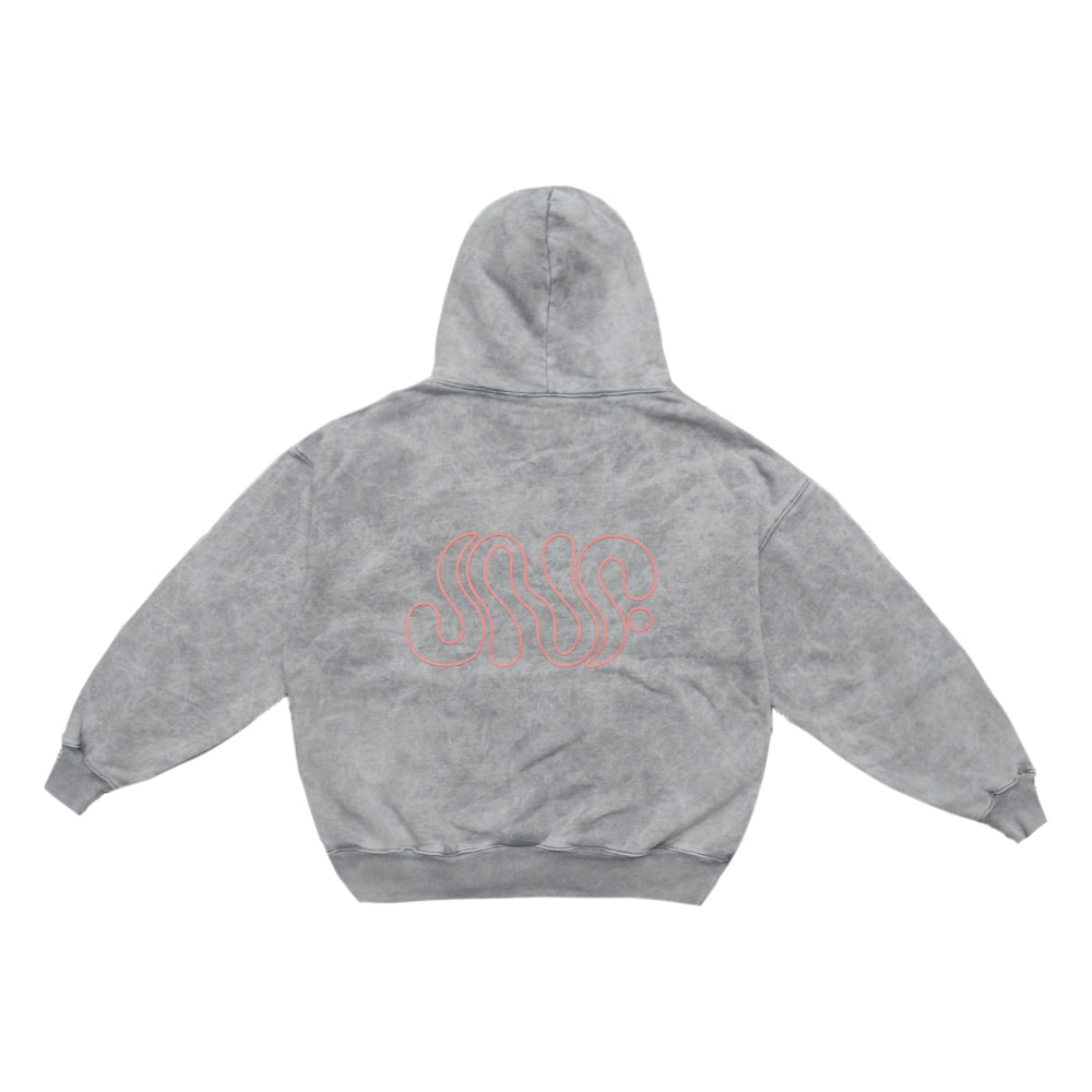 Horma semioversized algodón en burda, estampado frontal y trasero en plastisol con relieve. Efecto acid wash